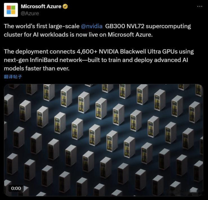 英伟达所指定的4608这个数字,意味着这里共有64套GB300 NVL72系统在运行,考虑到每个机架有72个Blackwell GPU和36个Grace CPU(总计2592个Arm内核)。从技术上讲,这与完整的超大规模扩展相比仍有差距,但这仍然是英伟达Grace Blackwell GB300的一个重要里程碑,该产品最近在推理性能方面创下了新的基准记录。微软表示,这个集群将专门用于OpenAI的工作负载,使高级推理模型能够运行得更快,并且能够在“几周而不是几个月”内完成模型训练。